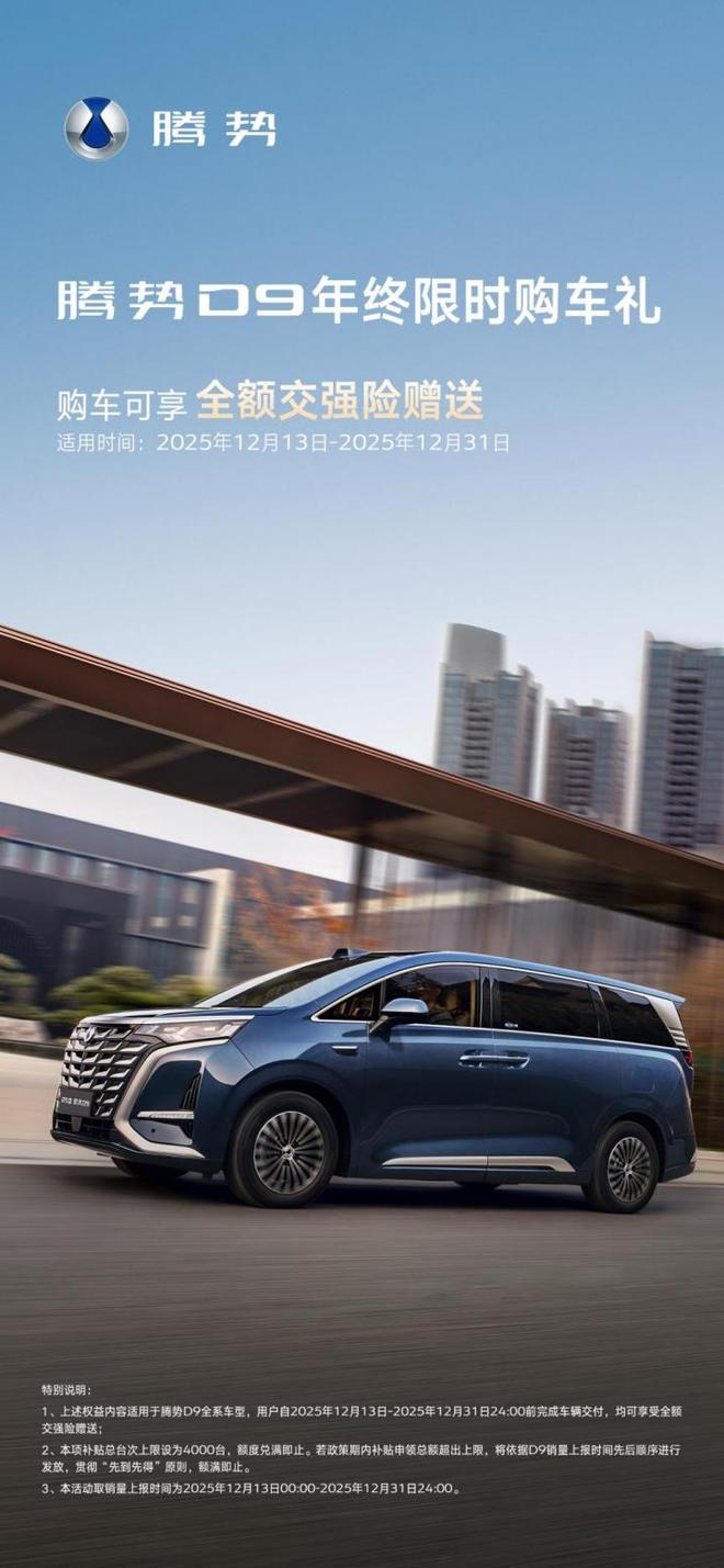 网易汽车12月13日报道:近日,腾势汽车宣布,腾势D9将在感恩节末推出“腾势D9·感恩30万+”活动。即日起至2025年12月31日,凡是购买并完成交付腾势D9的用户均可享受全额免费交强险的权利,腾势D9全系车型均可参加。在车末购车的重要节点,2025年12月13日至12月31日期间,完成腾势D9车辆交车的用户可免费全额享受交强险。该补贴上限为4,000个单位,仅在配额全部兑现后才能使用。若政策期内补贴申请总额超过上限,将按照D9销量报告的orras进行平分,并可享受腾势D9全系车型。腾势D9是全球首款交付30万辆的新能源MPV。由于其2022年上市,腾势D9连续两年夺得中国MPV市场年销量、保值率、用户满意度“三冠王”。 2025年1月至11月,腾势D9累计销量达84,549辆,再次夺得中国新能源MPV销量冠军。不仅如此,腾势D9在全球市场上也展现出了强劲的竞争力。 2025年上半年,腾势D9连续多月领跑印尼、泰国、马来西亚等国家豪华MPV销量榜,并以千元售价在新加坡、巴西等高端市场获得认可。今年年底向购车者提供全额交强险的政策,不仅是正确的购车之举,也是腾势汽车对用户价值的持续回应。