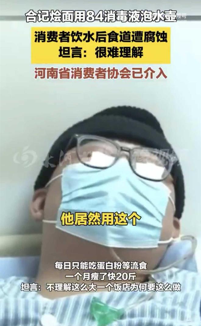 集木讯记者 张浩 河南郑州一家知名餐厅的服务员为了方便,用84消毒剂做了水壶。另一名服务员在不知情的情况下直接倒在顾客身上,导致顾客食道腐蚀。他已经一个多月没有出院了。 12月24日,郑东新区市场监督管理局工作人员表示,此事正在调查处理中。简先生仍在医院接受治疗。来源:大河新闻 据此前媒体报道,11月21日中午,简先生和三位朋友到郑州合记卤面忠义路店吃饭。喝完水后服务员从ke上倒水一点点,他们觉得味道不对。水有很浓的酸味。向服务员反映情况后,对方接走了水,但没有告知简先生水里添加的成分是什么。当天下午,简先生出现头晕、恶心、血压升高,立即送往医院救治。当晚与餐厅交谈后得知,店员用84消毒液浸泡水壶,他喝的就是这个水壶的水。我的食道被腐蚀损坏后,每天只能吃蛋白粉之类的流质食物。我一个月内减掉了大约20磅。 84消毒剂是常用来清洗垫子的,他实在难以理解一家知名餐厅会用它来清洗餐具。店员用84种消毒剂泡水壶 来源:大河新闻 12月24日上午,郑州合记卤面(忠义路店)负责人告诉积木新闻,这不是商店里不允许。为了省事,服务员偷偷在清洗水壶里滴了一滴原本用来清洗的84消毒液,泡了一个多小时就忘了。另一个服务员不知不觉就把它端到了桌子上。先生碰巧注意到一件事。饮后健异常。与简先生同行的人已经喝掉了前一瓶水,没有问题。事件发生后,所辖市监狱来到该店检查工作,该店进行了整改。涉事女员工50多岁,经过深入分析,被调到厨房。 “店家正在积极配合救治,昨天还去医院探望了。”前述负责人表示,该店已多次支付2万多元医疗费。目前,简先生仅花费了8000多元,并没有提出具体的赔偿要求。市政府辖区消协和市场监管部门已介入此事。图为涉事餐厅。来源:网友拍摄。郑州市郑东新区市监察局工作人员表示,事发后现场有人员在场。此事仍在调查中。一旦调查完所有事实,将采取适当的措施。潘普秀请注意,和记卤面是郑州餐饮有限公司独家经营的大众风味食品,起源于郑州,2011年被商务部认定为“中华老字号”。