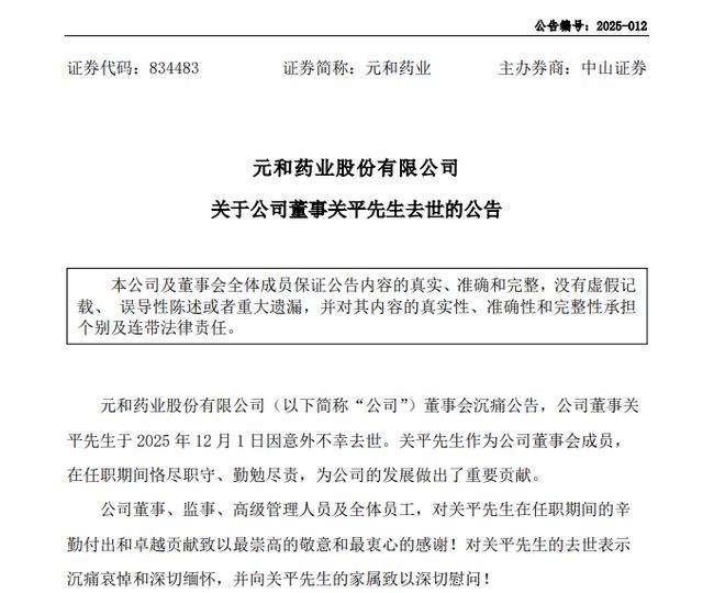 据红星资本局新闻12月5日消息,新三板公司元和药业(834483.nq)12月2日发布公告称,公司董事关平于2025年12月1日因意外死亡。元和药业发布公告。元和药业表示,公司董事、监事、高级管理人员及全体员工对关平先生在任职期间的努力和杰出贡献表示崇高的敬意和诚挚的感谢。我对关平先生的逝世表示深切的同情和深切的怀念,向关平先生的家人表示沉痛的哀悼。元和药业2025年半年报显示,关平出生于1961年10月,持有公司股份50万股,占公司总股本的0.81%。关平生前旧照 来源:中国药房视频账号截图 公开信息显示,关平是一名高年级学生中国医药行业职业经理人。自20世纪80年代末进入该行业以来,关平曾在3家世界十大制药巨头在华投资的制药公司工作过。他还曾在国有和私营企业任职。他是首批在华外资医药代表之一,也是中国医药企业的高级职业经理人。他曾经营过卡奇、百加黑等数十亿美元的产品,被业界称为“OTC(非处方药)药王子”。荣获全国十大职业经理人、南贡首届十大医学精英等奖项。他是很多职业经理人眼中的老师和兄弟。 1997 年,他加入惠氏白宫,担任区域营销总监,这是他职业生涯的一个重大转折点。国外总经理P.K对关平的钦佩之情是:“当你加入我们公司,你就会走在行业的前面”。当时,公司的主打产品钙D被从公费药品清单中剔除,也因此从医院转向OTC零售市场。1998年,钙奇多销售额不降反升近20%,零售市场份额超过医院。他对创新营销方式的不断研究,体现在他对“白加黑”感冒药的经营上。2001年,关平加入东升科技,担任董事、总经理。在国家要求拒绝含有PPA(苯丙醇胺)的药品制剂之际,刚刚接手百家黑的国内第一感冒药康泰克却在大肆宣传百家黑的“不含PPA”广告的同时,还与零售药店合作提出了“OTC代表进店要做的24件事”,并要求大量销售人员。o 关注终端上的活动和显示。此后,百家黑的销售额从2000万元以上跃升至2亿多元。到2004年,东升康安家族销售额突破5000万元,百家黑更是创下了5亿元的纪录。关平先生分别于2004年和2005年被评为“中医十大职业经理人”和“中医年度人物”。在《中国医药报》2009年的报道中,关平对“职业经理人怎样才能过上好日子”这个问题给出了两个答案:一是要帮助公司踏踏实实做事,帮助董事长分担风险、创造利润;二是要帮助公司踏踏实实做事,帮助董事长分担风险、创造利润;二是要帮助公司把事情做好。其次,他必须有声誉。至少业内人士提起时,都会说“老关是个好人”。据界面新闻报道,12月4日,关平的业内朋友表示,他相信关平不仅做到了这两点,而且做得比同样好的人还要好。 He提到,关平在这么多家公司工作过,业内从未听说过哪个老板说他关系不好,或者说他在是非面前有瑕疵。他认为职业经理人值得尊重,而且在行业内很难找到。 (本文不构成投资建议,操作风险自担)编辑侯春平综合界面报中国医药报公司公告审核冯玲玲